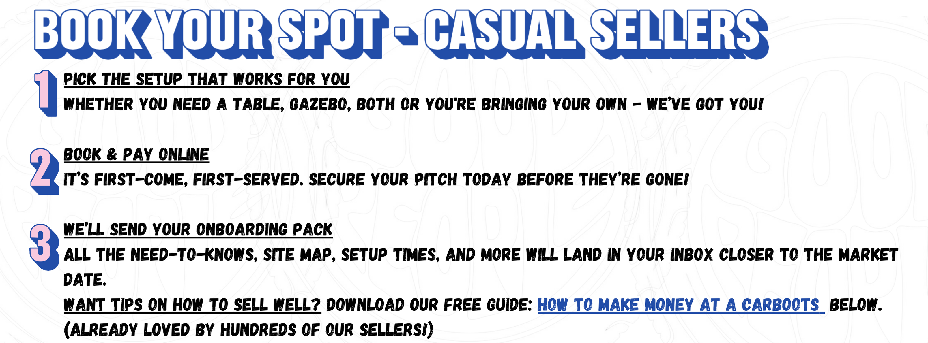 Booking: All pitches must be pre-booked. Pitches are non-changeable and non-refundable. In the unlikely event we have to cancel a carboot market due to severe weather we will issue you a full refund. Please ensure to check your schedule before booking.
