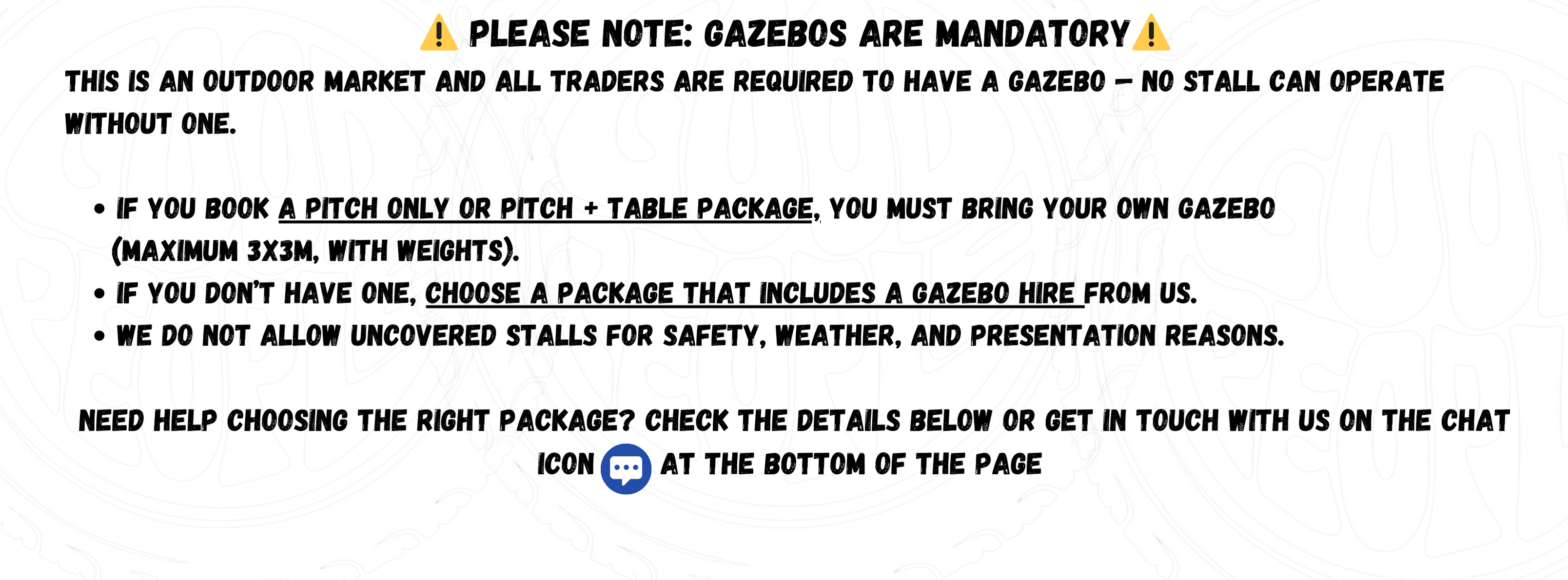 Smoking: Smoking is prohibited in or around any Gazebos or Pitches on the market site due to fire and safety risks. Please leave the site to smoke- do not leave your stall unattended ensure you have someone to cover.
